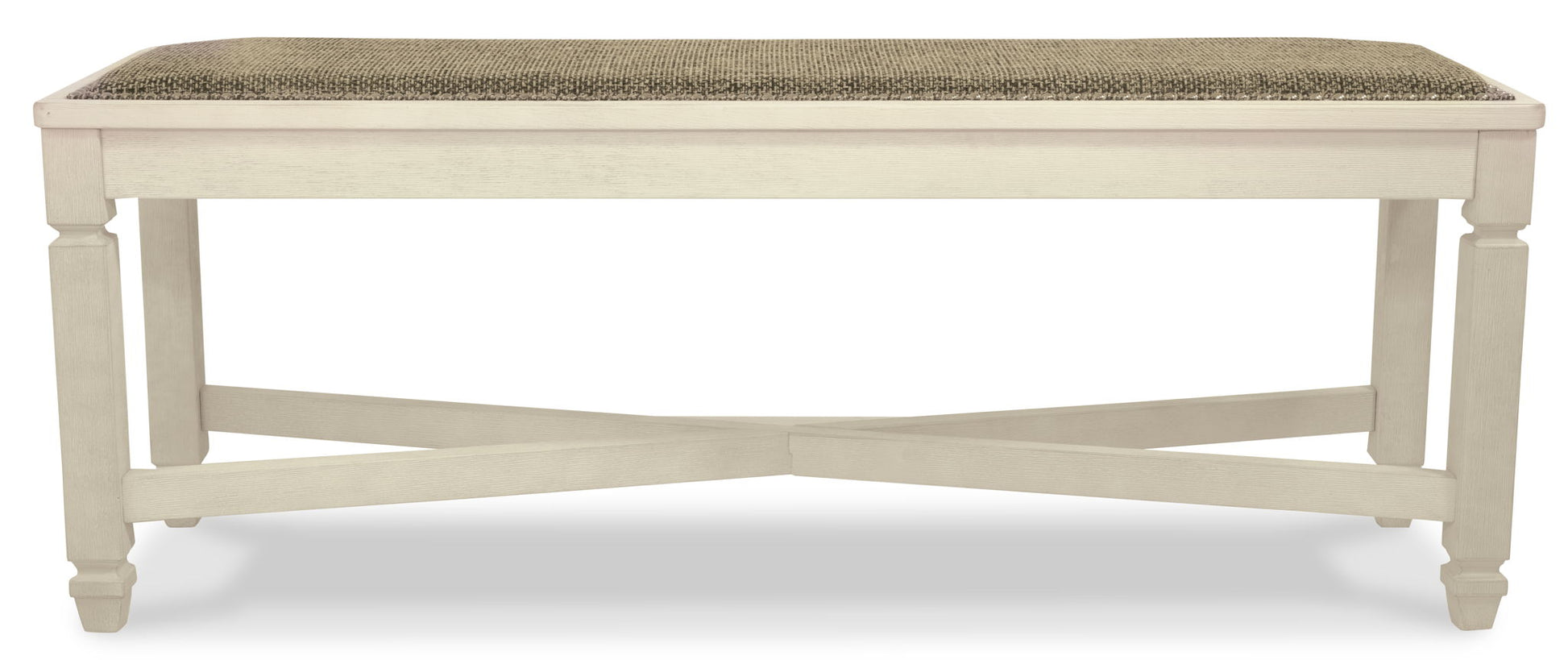 The beauty of this upholstered dining bench is something to savor. Serving up comfort and flair, this generously scaled bench entices with a cushioned seat covered in a heavy woven fabric that complements the antiqued white finish.