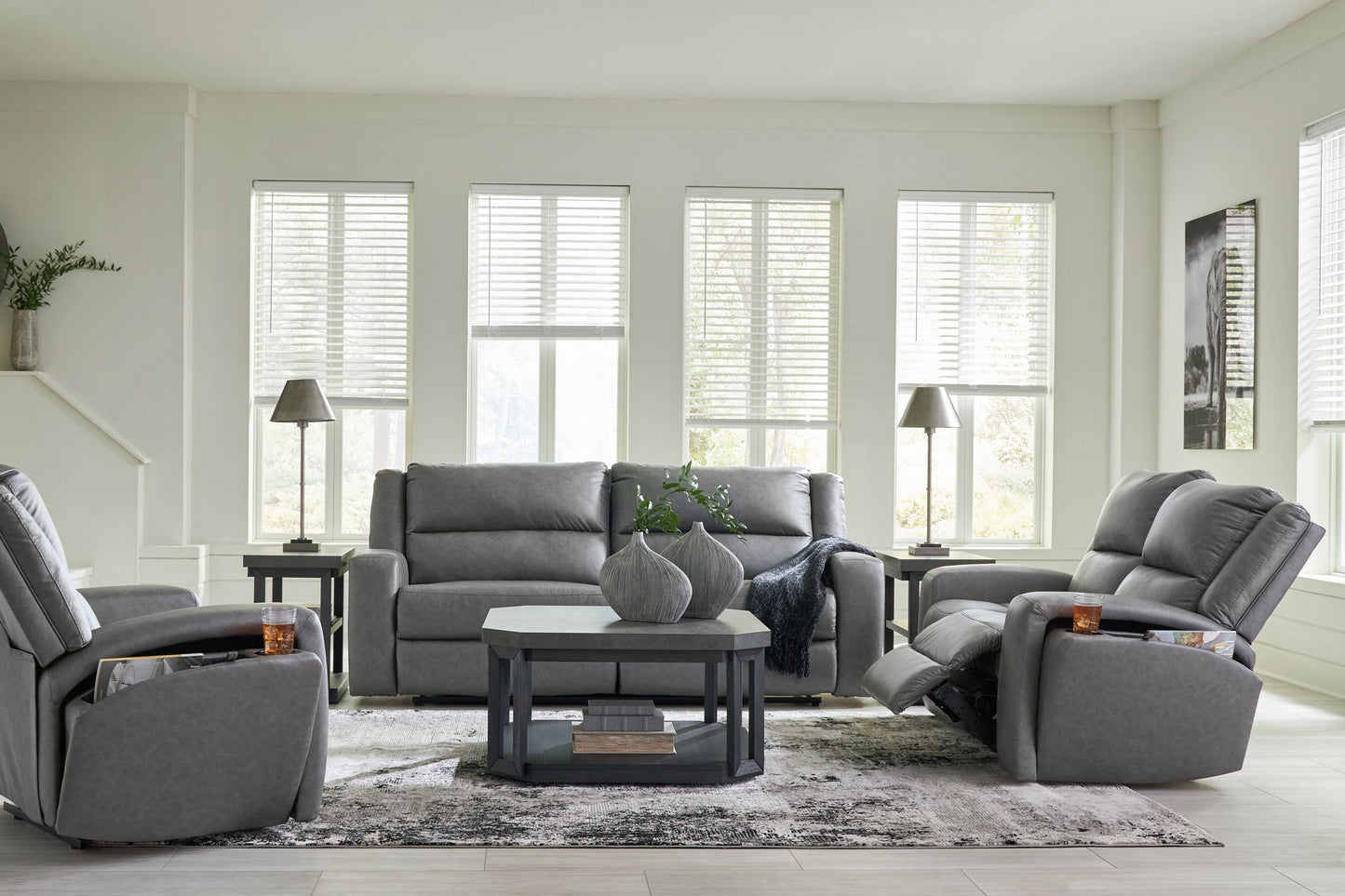This reclining set appeals to your love for feature-filled furniture, all while maintaining a clean-lined and contemporary design. Pop-out storage and cup holders keep essentials close when you need them and tuck away easily when you don’t. Time to recline? A subtly placed handle extends the footrest with a simple pull. The sleekest of seating options, this sofa expertly balances form and function.