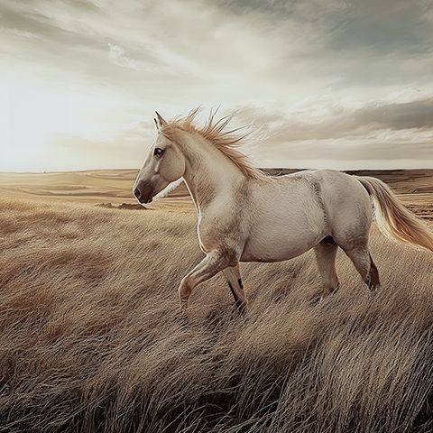 This wall art brings serene beauty to your home. This captivating print on glass captures the grace and majesty of a wild horse galloping through a golden field. The warm, earthy tones and dynamic composition create a sense of freedom and movement. It's a perfect choice to enhance your wall decor with nature-inspired artistry.