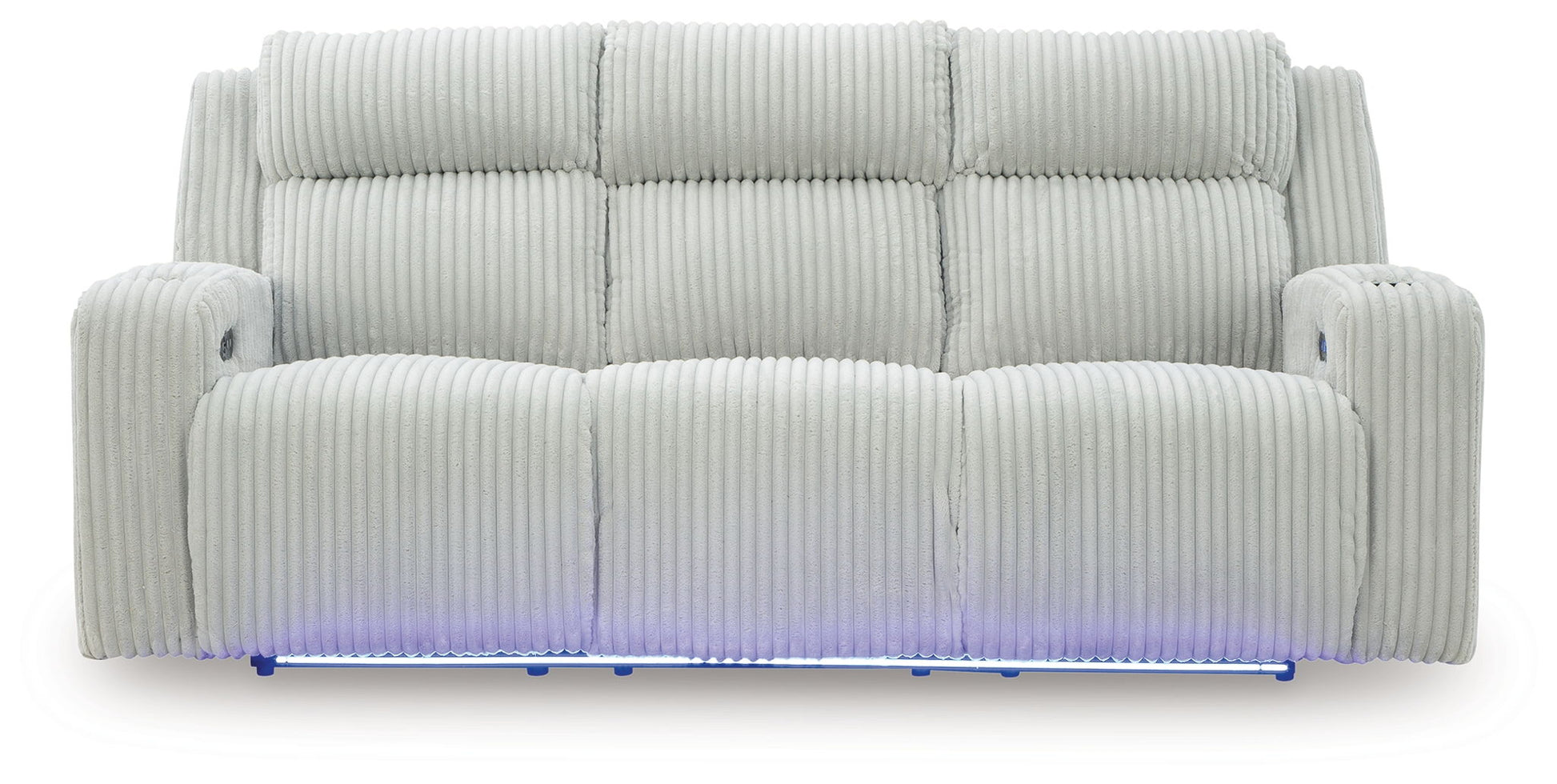Trend-right style, meet irresistible modern function. Your living room gets a cozy-cool upgrade with this power reclining sofa. Curl up in its ultra-chic corded upholstery and recline with one-touch controls. Is it movie night or game time? With ambient LED lighting and wireless audio connectivity, this sofa transforms from a serene relaxation spot to an entertainment hub. Its drop-down table, USB charging and cup holders make lounging all the more convenient.