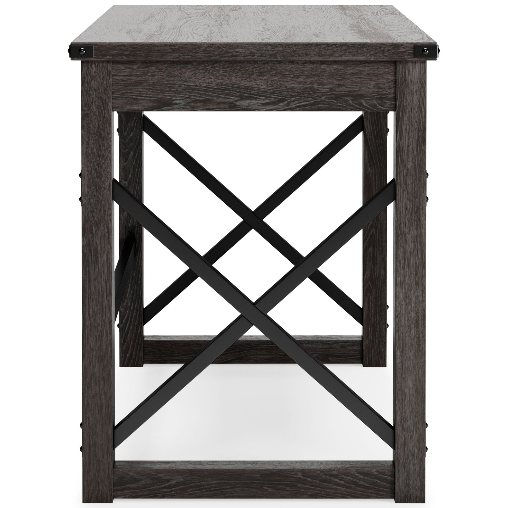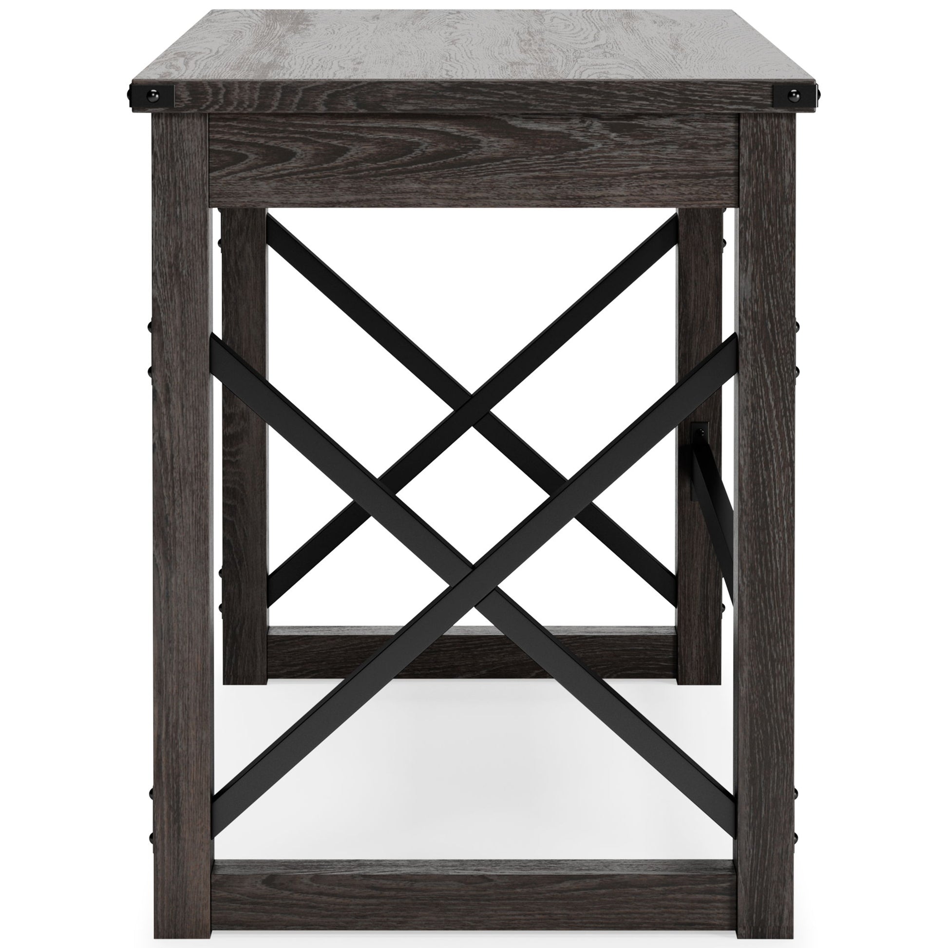 Love an urban farmhouse aesthetic? Make it work to your advantage with this beautifully styled desk. This simply striking choice in home office furniture has an unmistakable farmhouse feel thanks to design elements including a gray decorative wood grain laminate contrasted with crossbuck rails, metal accents and a stretcher in black. Perfect for office supplies, the desk includes a handy center drawer with hardware-less aesthetic to help keep your desk top clutter free