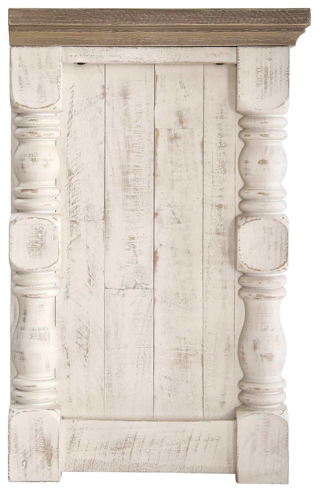 - Two-tone distressed finish: weathered gray top; vintage white base