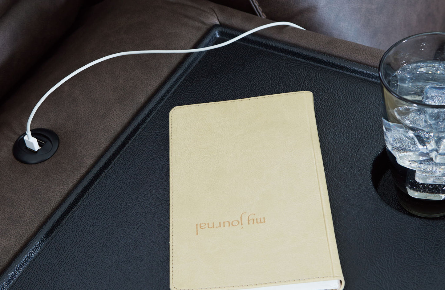- Drop-down table with 2 cup holders and 2 USB charging ports