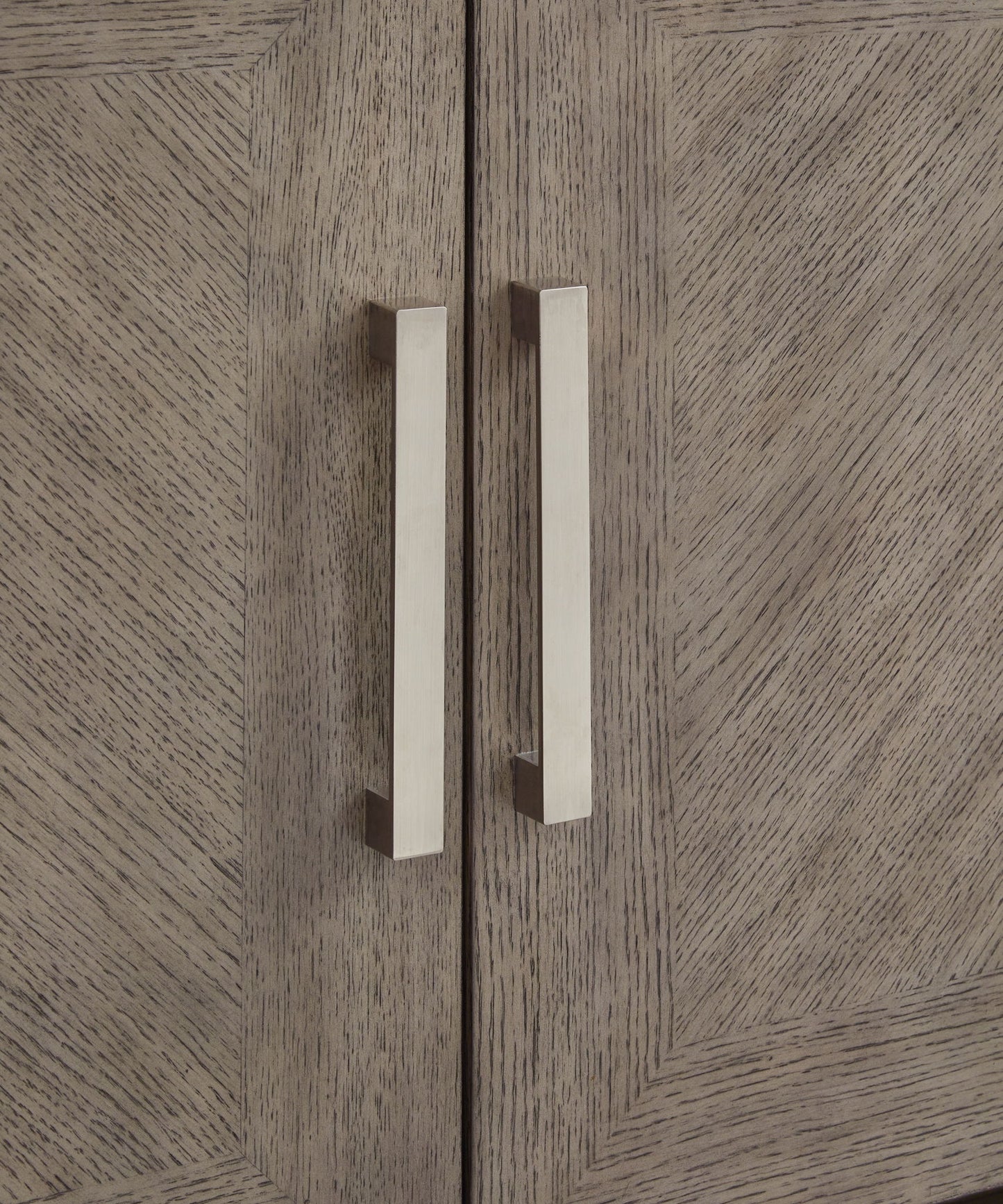 Welcome casual, contemporary style and functionality to your home. This TV stand delivers a mixed-material vibe with its white marble top and grayish brown finish, lending a laid-back look that’s so welcome at the end of a long day. Cabinet doors with framed chevron accents and large silvertone pulls add dimension and style. And there’s plenty of room to store entertainment accessories, with adjustable shelving and cord management holes for added convenience and versatility.