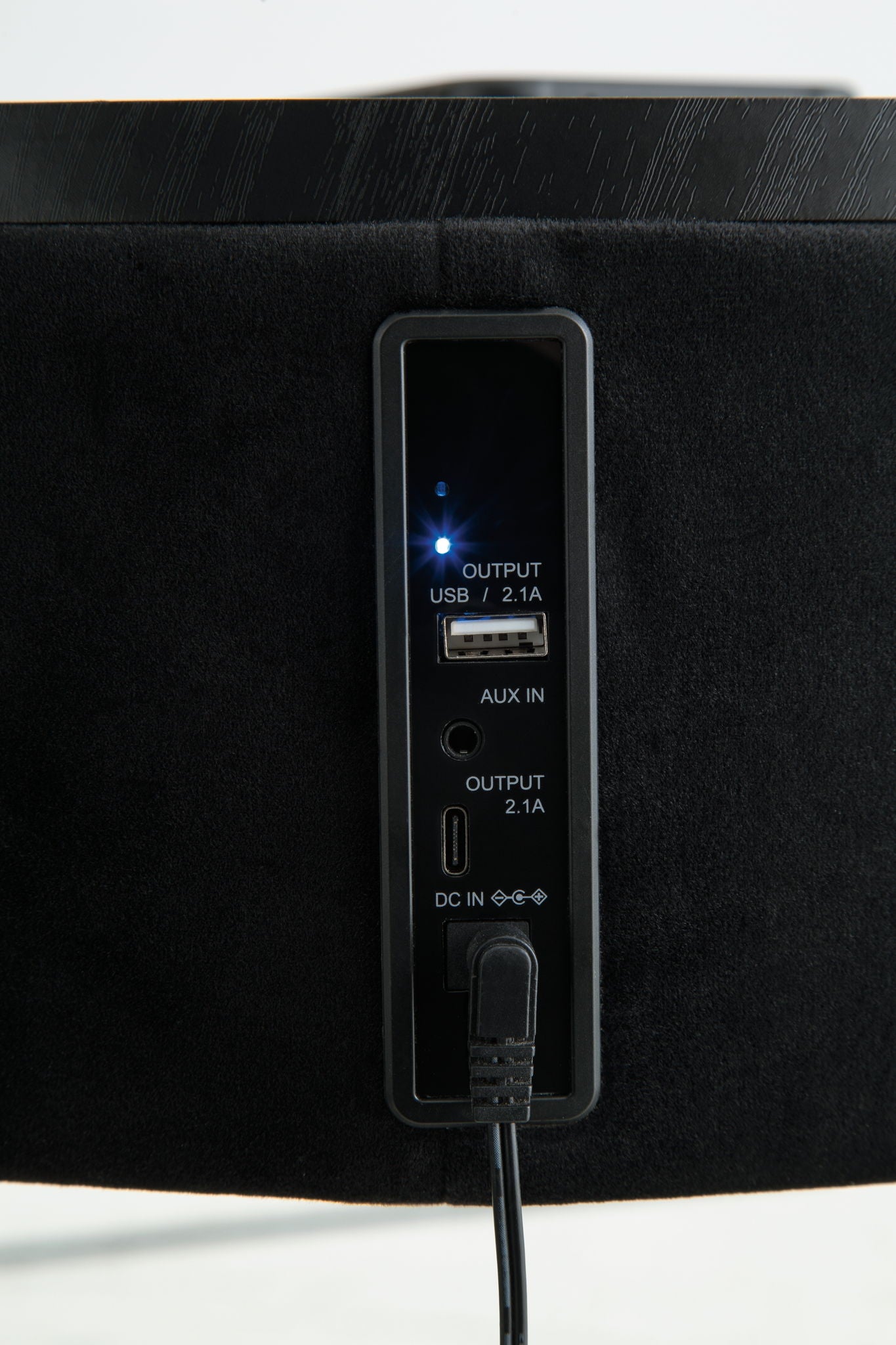 Discover the perfect combination of contemporary style and space-saving functionality. This accent table is designed with an integrated speaker (complete with wireless charging and touch-button controls), allowing you to effortlessly stream your favorite tunes wirelessly. Its sleek glass top perfectly complements the modern black fabric on the sides. This table is gonna be music to your ears.