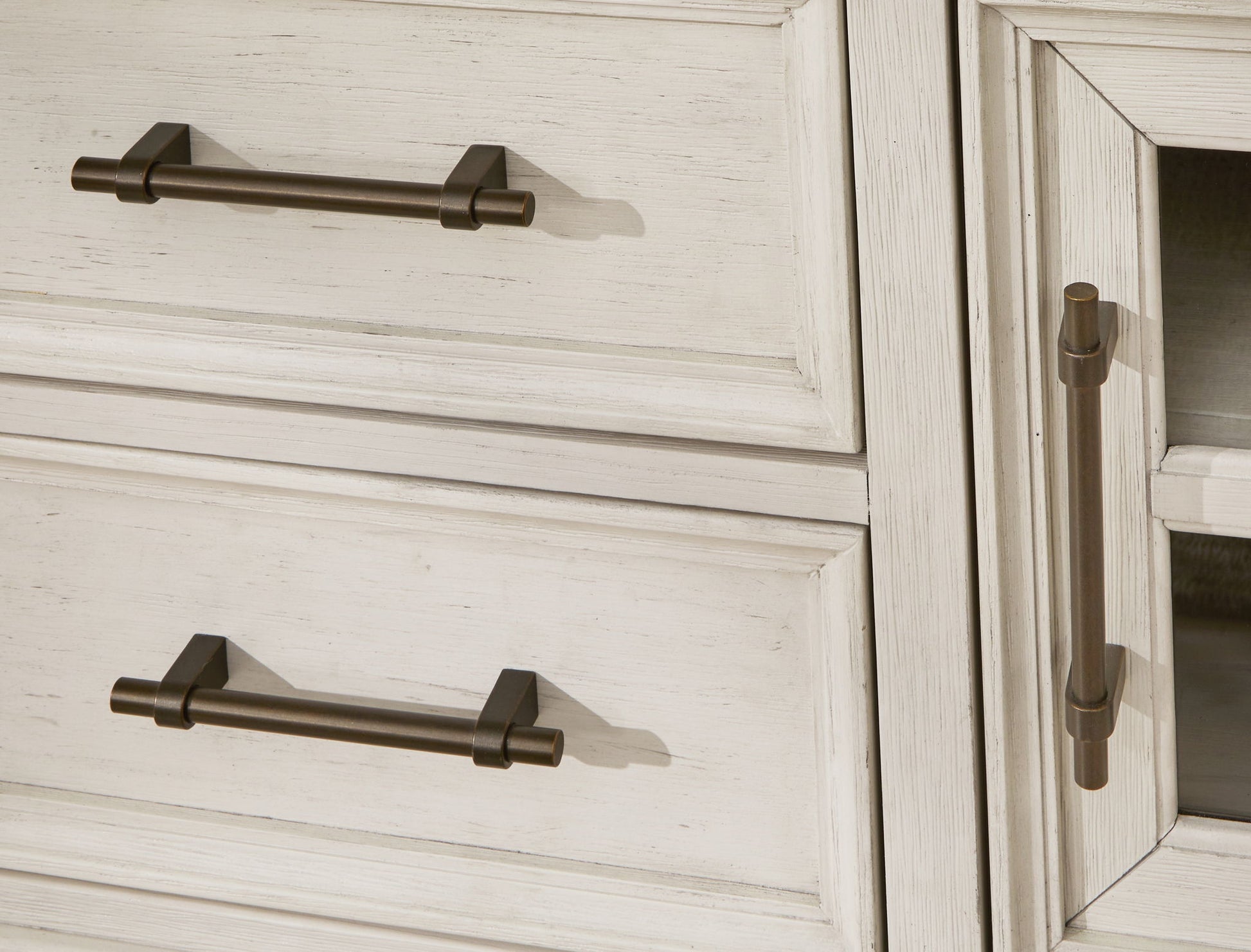 This dining server elevates the art of modern farmhouse design. Its two-tone aesthetic blends antiqued white and light grayish brown for a charming finish. Two windowpane doors with adjustable shelves and dark rustic bar pulls convey a feeling of relaxed comfort. Now your only worry is what to serve for dinner.
